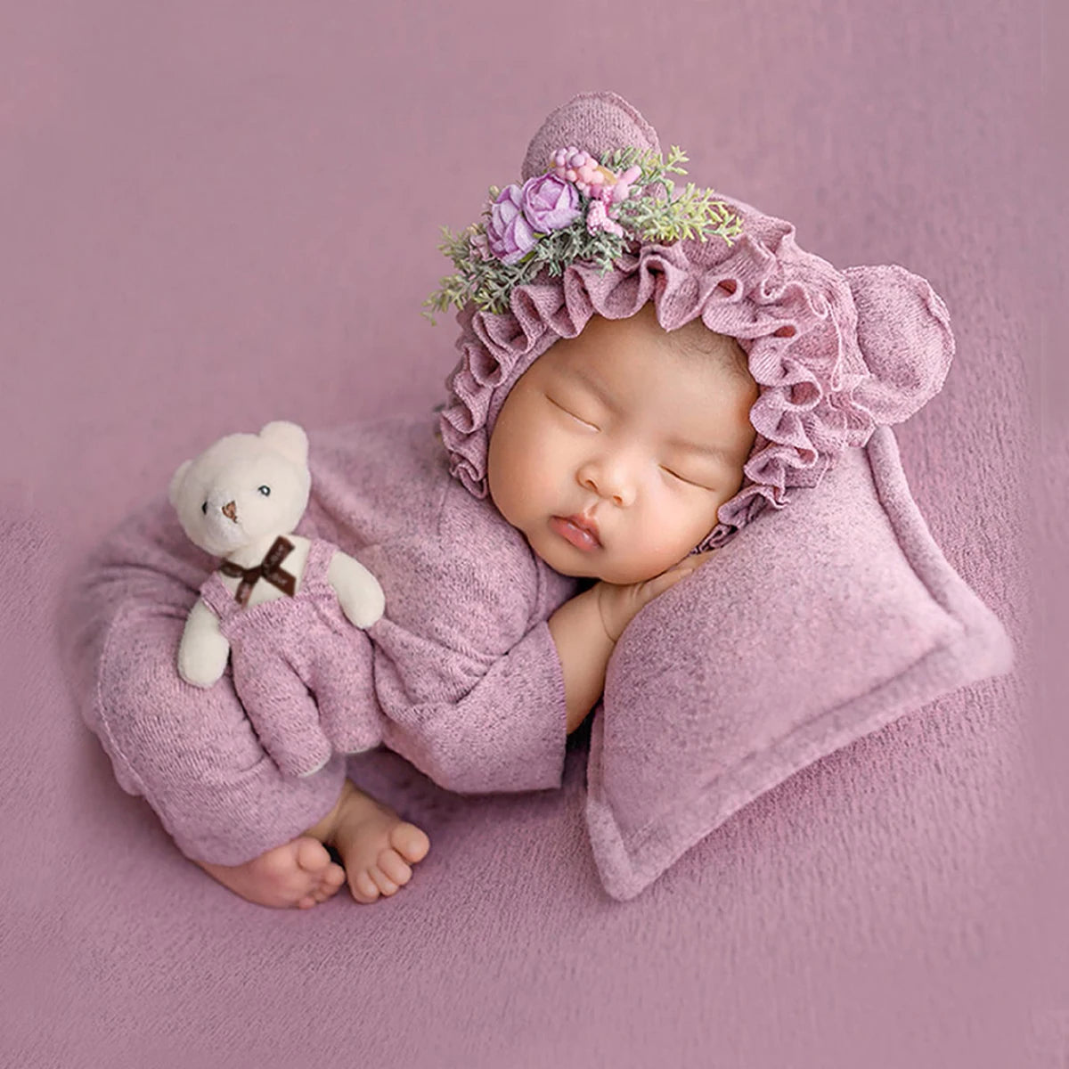 032-Ensemble de Photographie pour Nouveau-né – 4 Pièces avec Chapeau et Poupée Ourson